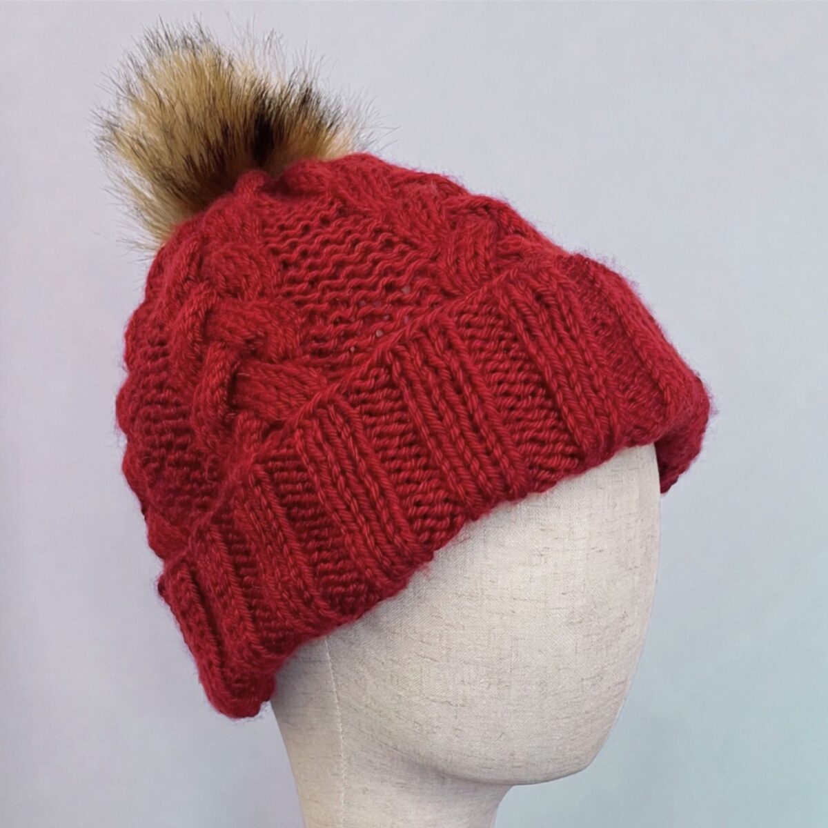 Handmade Knit Beanie in Autumn Red – Faux Fur Pom Pom
